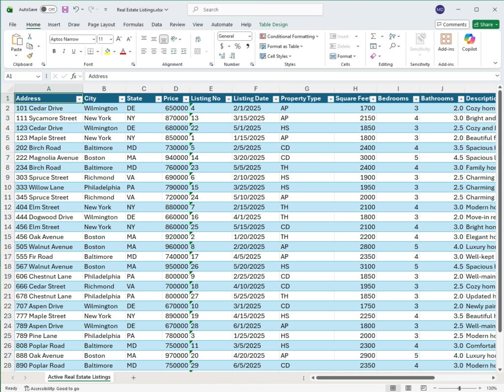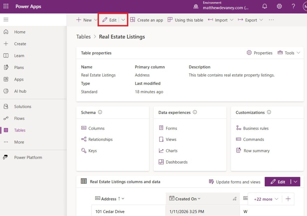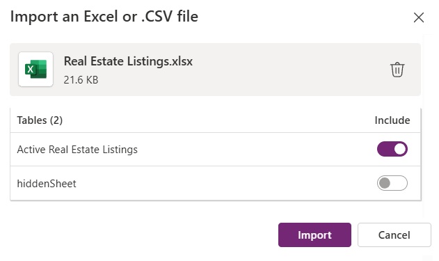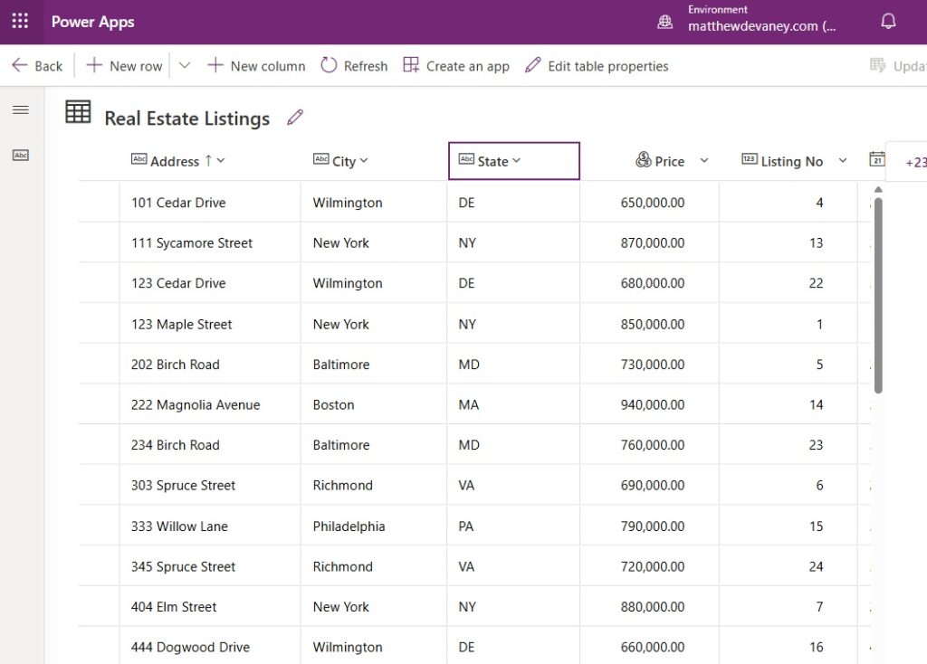 We will begin by creating a new Dataverse table by importing an Excel file containing real estate listings which can be downloaded from Github. Each listing has the following information: