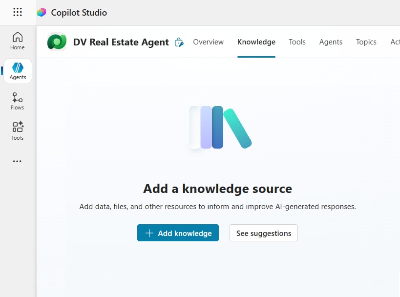 Open Copilot Studio and create a new agent named DV Real Estate Agent. Go to the knowledge menu and press the Add Knowledge button.