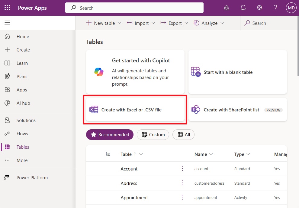 Open make.powerapps.com and create a new table using the Create with Excel or CSV file option.