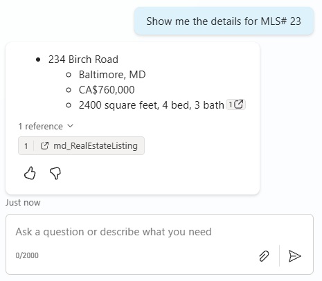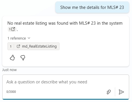 Save the changes to the Dataverse knowledge source and retry the query “show me the details for MLS# 23.” This time the agent returns the correct response.