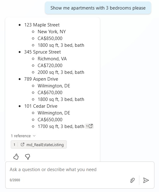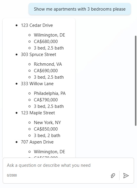 The Real Estate Listings agent is used by home buyers to search for properties using only natural language. Listings data is stored in Dataverse.