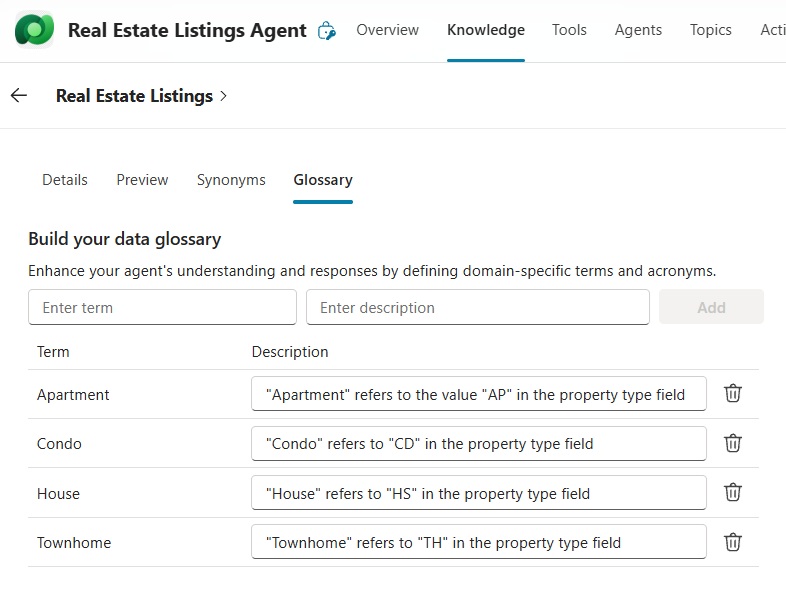 Add this set of terms and descriptions to the agent. The term should be the expected value the user will type. And the description should include the value as it is found in the Dataverse table, and optionally specific a column name.