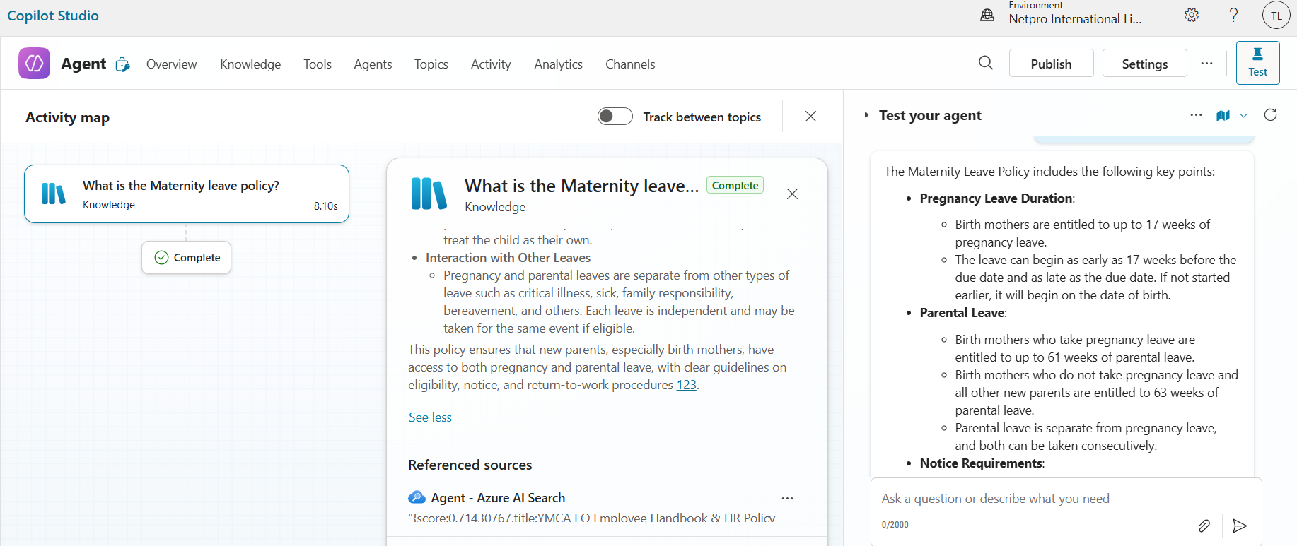 Let’s test our Copilot Studio Agent that we connected to Azure AI Search. Open the Copilot Studio test panel and ask the question “What is the maternity leave policy?”