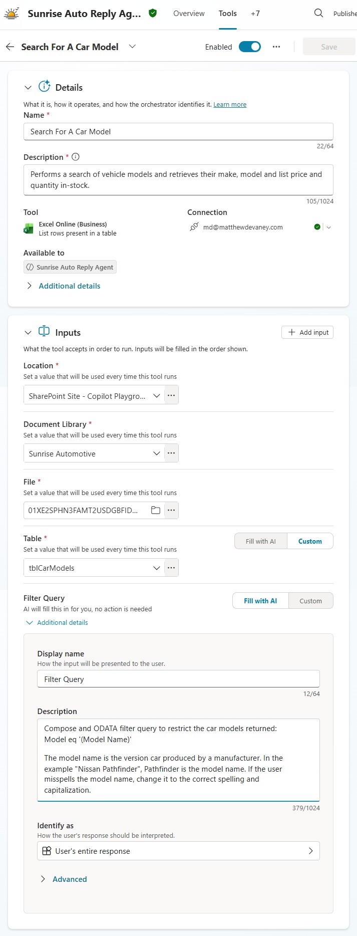 The agent uses a tool to gets list price from an Excel file. Go to the tools menu and add the Excel Online (Business) action named list Rows present in a table. Configure the action as shown in the screenshot below.
