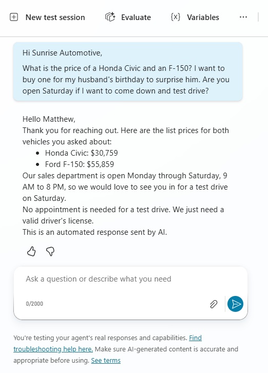 The agent now has the ability to respond to questions about car pricing and general questions about Sunrise Automotive. Open the test chat window and ask the agent a question.