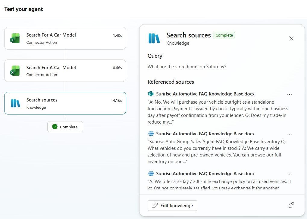 To get information needed for the response, the agent performs uses tools twice and searches it knowledge sources. Then the agent responds back with an answer in the proper formatting.