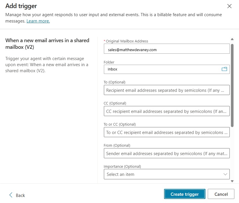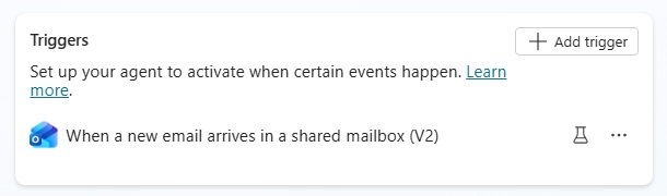 When the sales inbox receives a new email the agent will begin to process it. Go to the triggers section on the overview tab and select add trigger. Choose the trigger when a new email arrives in a shared mailbox if a shared inbox is being used. Or, if a personal inbox is being used, select the when a new email arrives trigger instead.