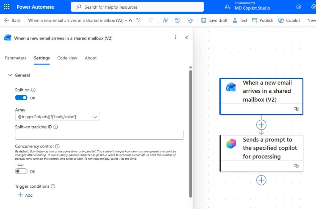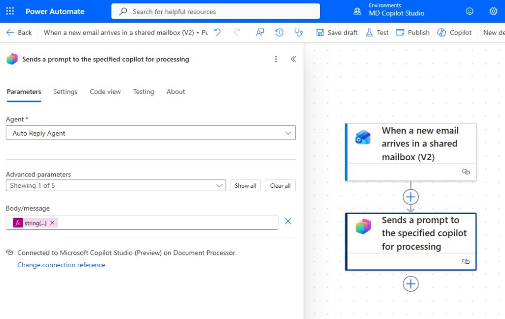 We’re done. Save and publish the agent. Then test the agent by sending an email message to the shared inbox.
