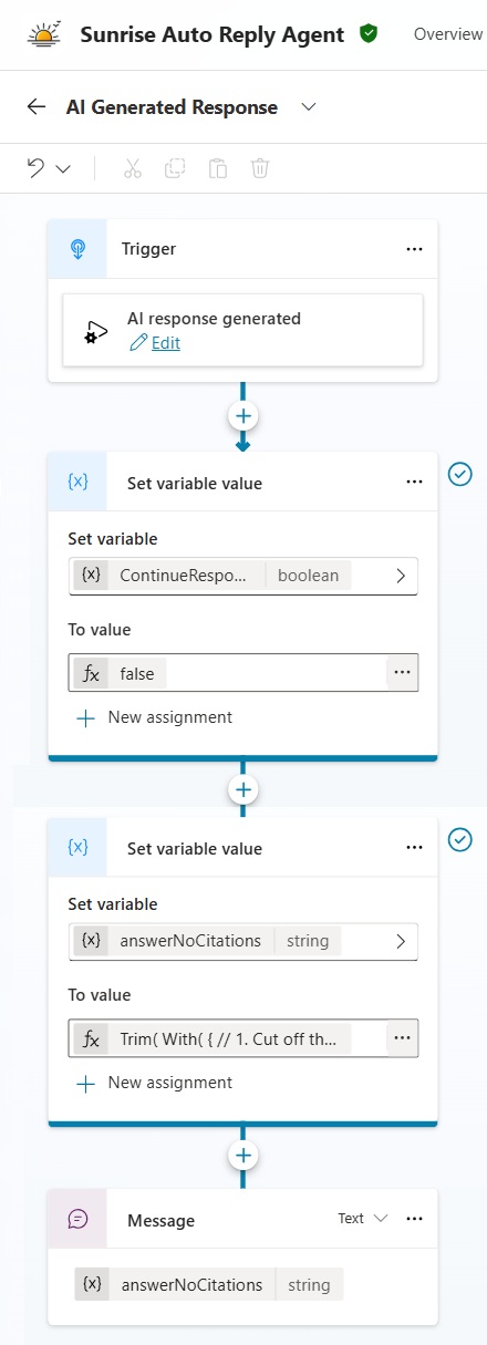 To remove the citations, create a new topic named AI Generated Response and choose the trigger AI Response Generated. This gives the agent the ability to intercept an AI generated message and alter it before showing the message to the user.