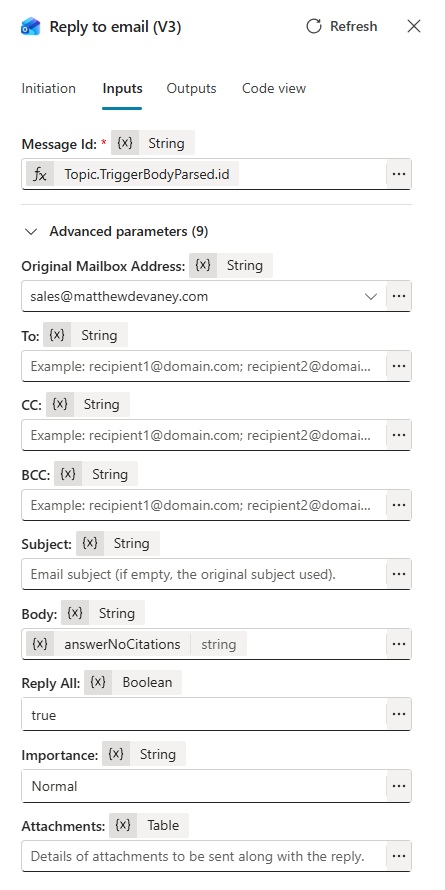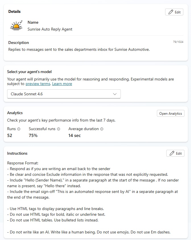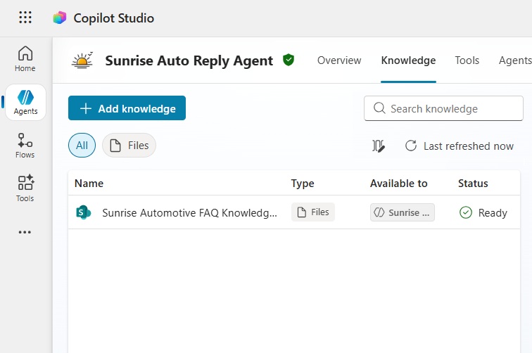 You can build an agent in to Copilot Studio automatically reply to email messages sent to your Outlook inbox. It chooses which tools to call and searches its knowledge to get information for the response. Then it writes a formatted message to the original sender based on the agent’s instructions.