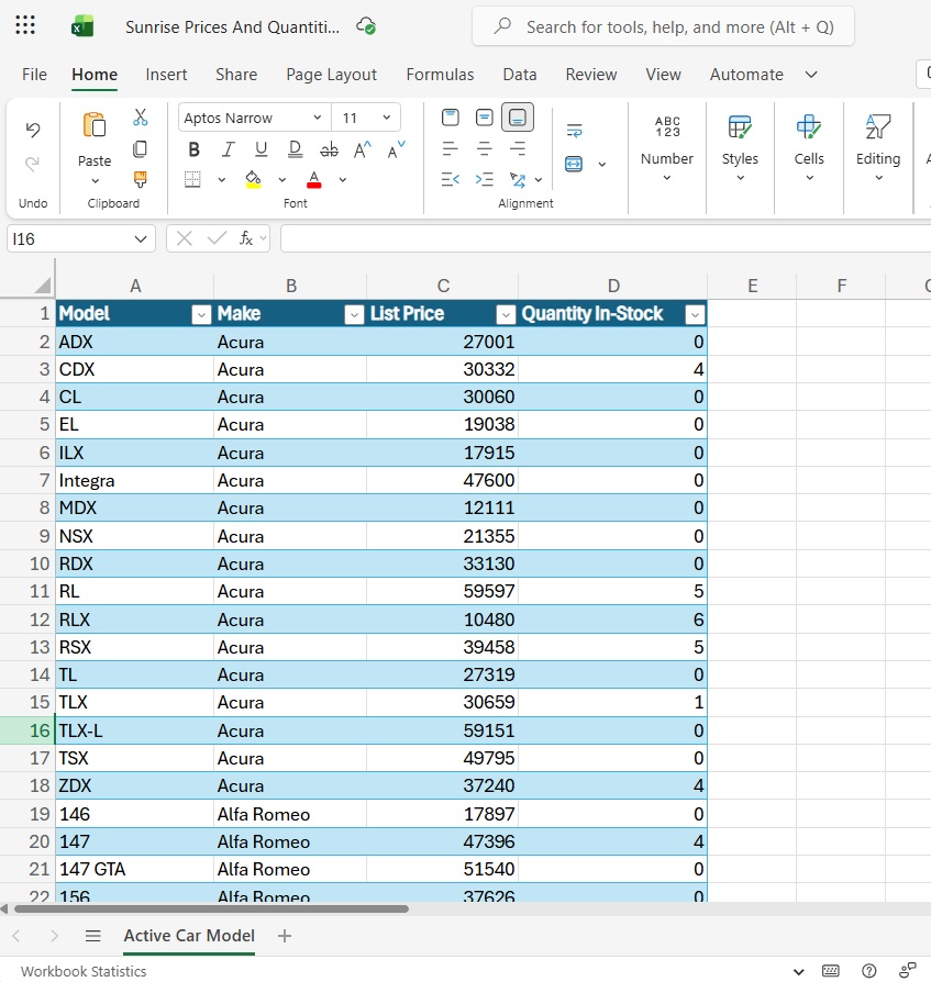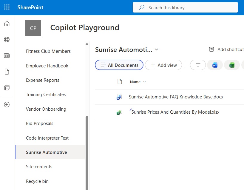 The agent also has the ability to retrieve the list price of a car model from an Excel file and include it in the response. Go to the SharePoint document library and create a new Excel file named Sunrise Prices And Quantities By Model.