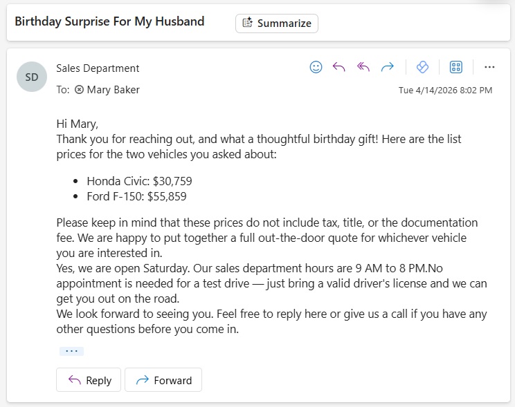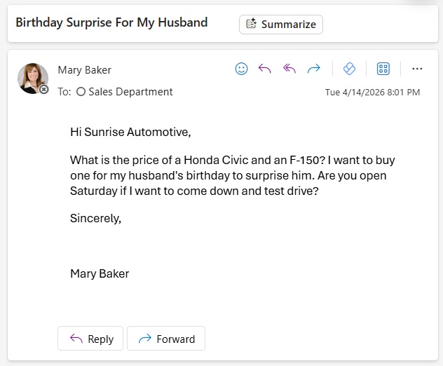 A car dealership named Sunrise Automotive receives a message from a customer in their sales department inbox. The message includes a questions about car prices and store hours.