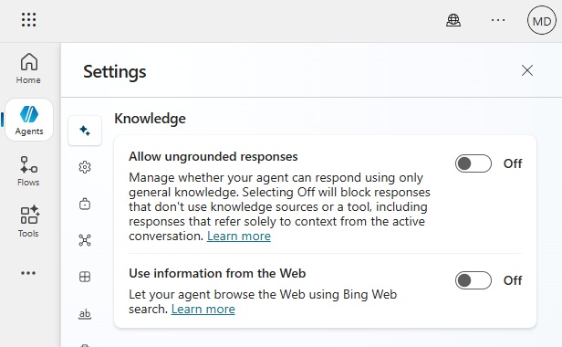 We only want the agent to respond with answers from the uploaded document. And we do not want it to generate its own answers or use information from the web. Go to the agent’s settings menu and turn off allow ungrounded responses and use information from the web.