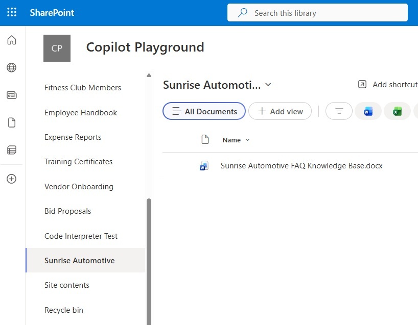 Create a new document library and then create a new Word document named Sunrise Automotive FAQ Knowledge Base.