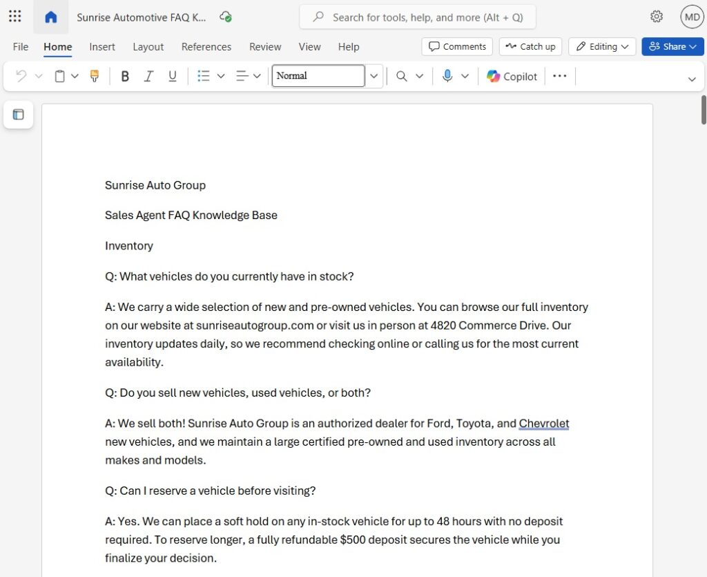 The agent relies on a set of frequently-asked questions to answer many of the questions a customer has. They are included in a Word document stored in a SharePoint document library.