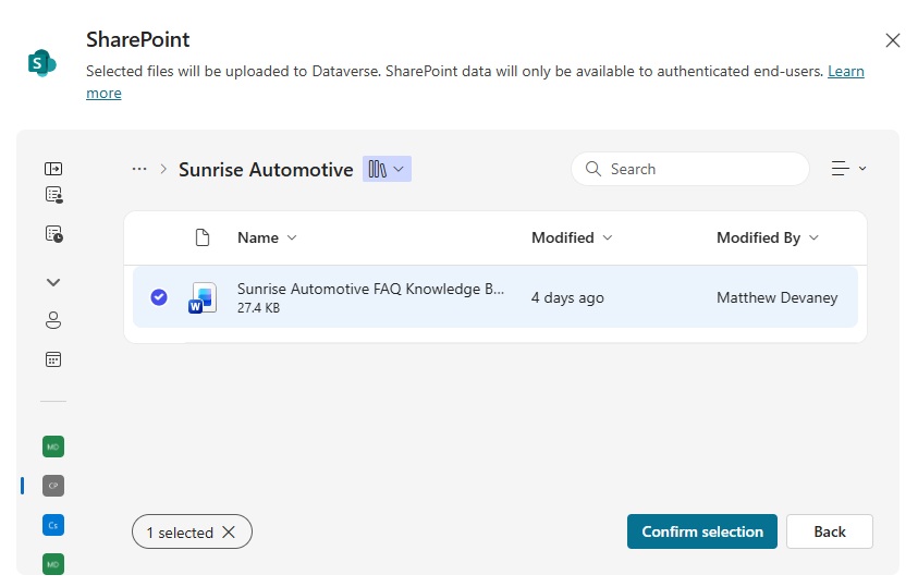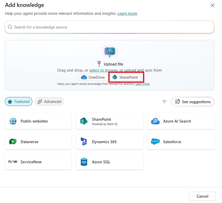 Next, go to the knowledge tab in Copilot Studio and choose upload a file from SharePoint.